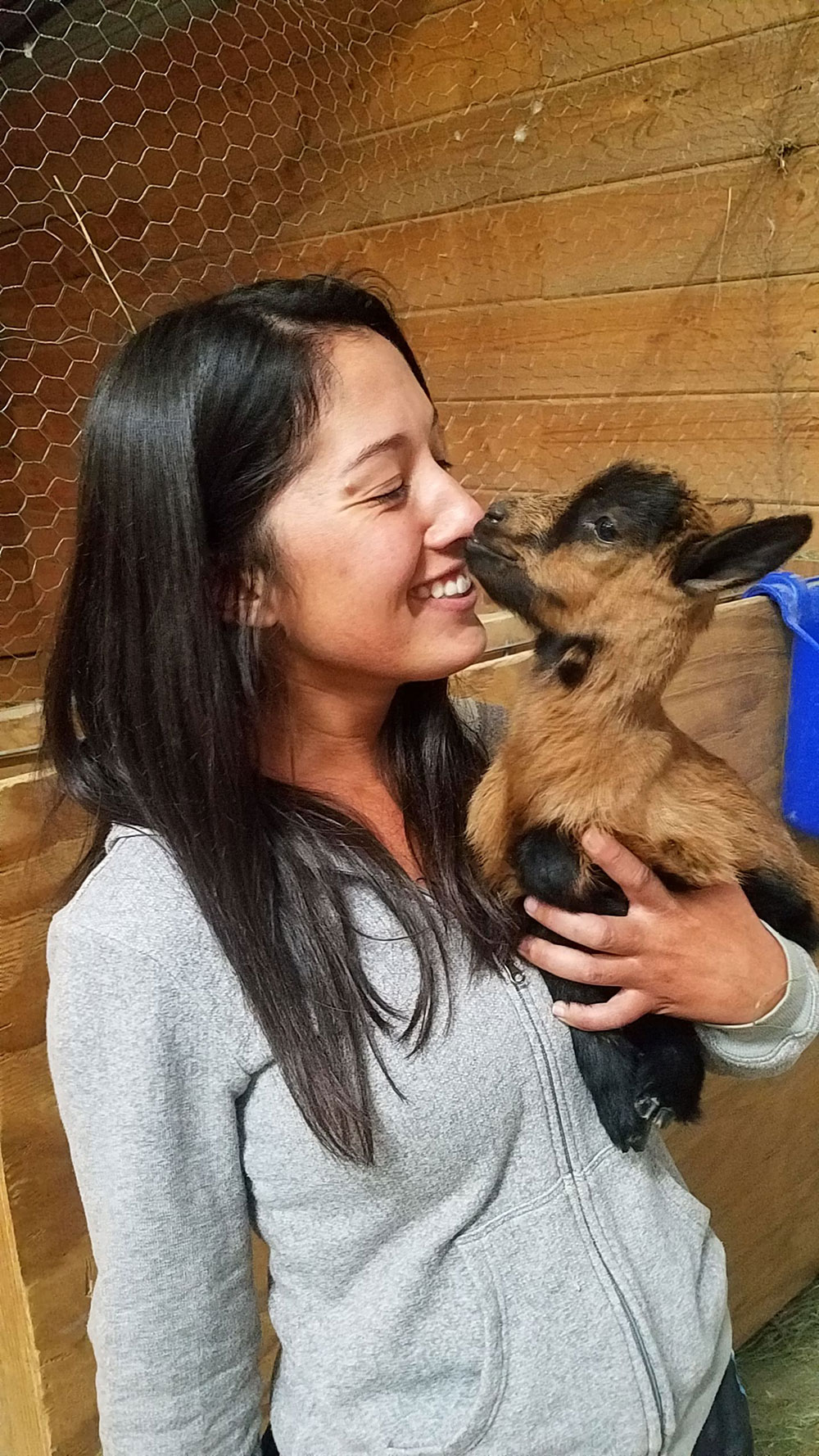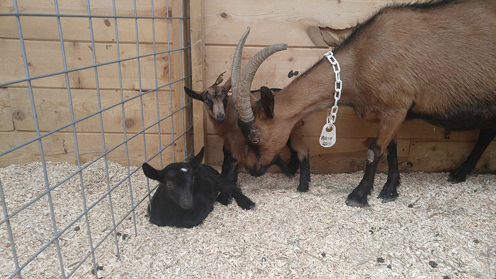 From raising goats, Gina quickly learned that goats are very emotional creatures! They live in packs, or herds, and will cry endlessly if separated from their herd. Also, goats are extremely affectionate with their humans, especially if you raise the goats from infancy and bottle feed them, they will consider you their mom/dad and follow you around. There is a definite pecking order to the herd: the matriarch will let the youngsters or new goats know their place. The horned goats usually have an advantage over the non-horned goats when it comes to feeding time, and we have had to wrestle with this situation at Mountain Goat Lodge, as we have both horned and non-horned goats.